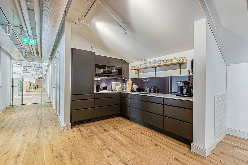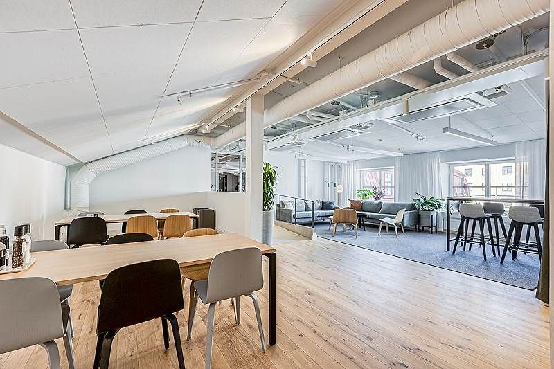 Modernt pentry med stor lounge och sällskapsyta men kan såväl nyttjas för kontorsplatser på halva ytan.