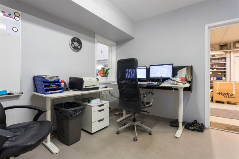 I övre planet finns kontorsrum i olika storlekar men kan även nyttjas som lager då hiss finns tillgängligt till övre planet.