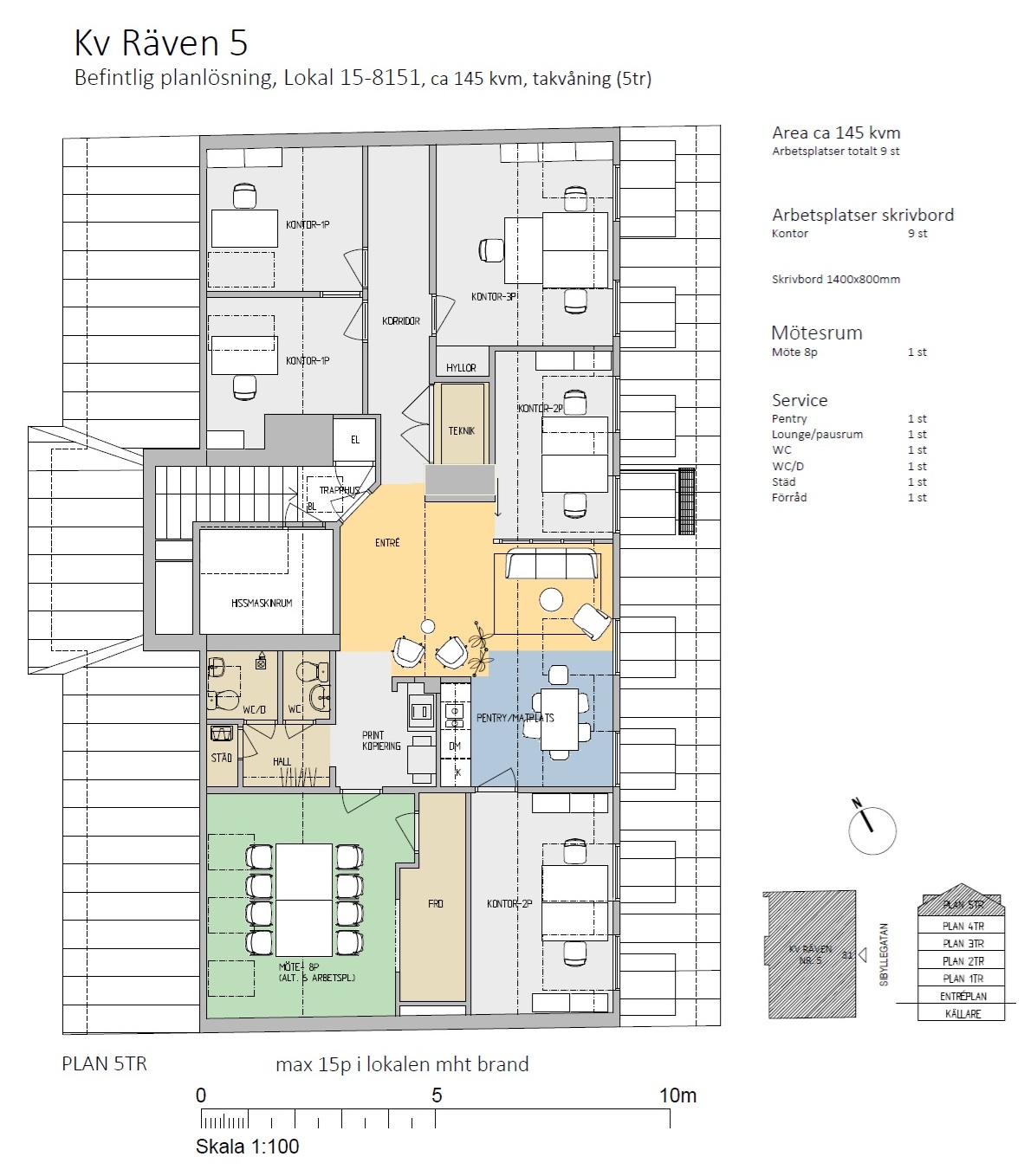 Lokalen har en rumsindelat planlösning som fördelas på totalt 6 rum samt pentry i öppen planlösning. De två största rummen ligger på vänster sida när man stiger in i lokalen. Det ena nyttjas med fördel som konferensrum. Lokalens pentry ligger i lokalens hjärta i anslutning till entrén. På lokalens högra sida finns ytterligare 4 arbetsrum.