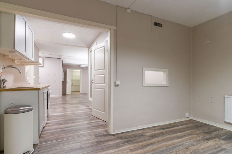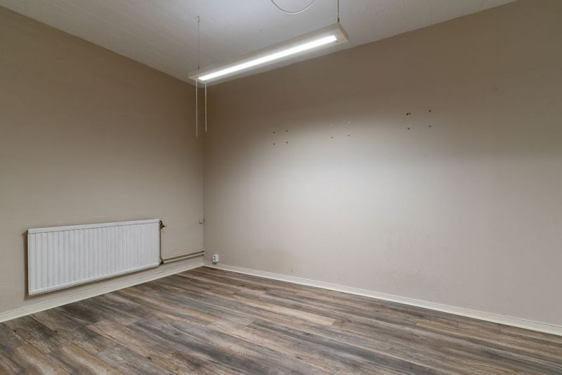 Planlösningen fördelas på en välkomnande öppen entréyta, ett mindre kontorsrum samt en öppen fönsterlös yta längst in i lokalen som med fördel kan nyttjas som ett mindre lager. Det finns även ett rymligt förråd direkt till vänster i anslutning till entrén. Pentryt är placerat i den öppna ytan mitt emot arbetsrummet. Det finns även ytterligare ett rum med pentrybänk och ett kassaskåp samt en fräsch wc med duschkabin.