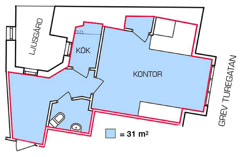 Du möts av en välkomnande entrén med plats för avhängning. I entrérummet får även ett mindre skrivbord plats, men ytan kan även nyttjas som väntrum. Direkt till vänster efter entrén finns ett mindre men funktionellt snyggt pentry i grått med diskmaskin och grått klinkergolv. Till höger efter entrén finns en exklusivt renoverad helkaklad wc med grått klinkergolv och dusch. Kontorsrummet är rymligt och här finns plats för ca 3-4 arbetsplatser samt soffa/soffgrupp. Sammantaget är lokalens planlösning mycket väldisponerad och samtliga kvadratmeter utnyttjas effektivt. Lokalen är i mycket fint skick samtidigt som den har en bevarad gammaldags prägel och charm från byggnadsåren så som generös takhöjd, vackra spegeldörrar, ljusbetsad fiskbensparkett och snedtak. Lokalen är mycket ljus och fönstret i kontorsrummet vetter mot Grev Turegatan.