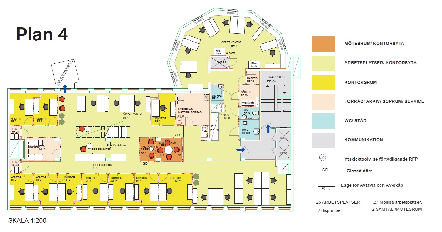 Plan 5 om ca 450 m2: Här finns 11 stycken cellkontor lämpliga för 1 person vardera. Övrig yta utgörs av två kontorslandskap samt en öppen yta med plats för ca 4 arbetsplatser. Det finns ett samtalsrum lämpligt för 4 personer samt 4 mindre för 1 person. Större konferensrum finns att tillgå på husets entréplan. Pentryt är central placerat i öppen yta. Lokalen har två wc varav en tillgänglighetsanpassad. Det finns även några mindre förrådsutrymmen samt miljöstation.